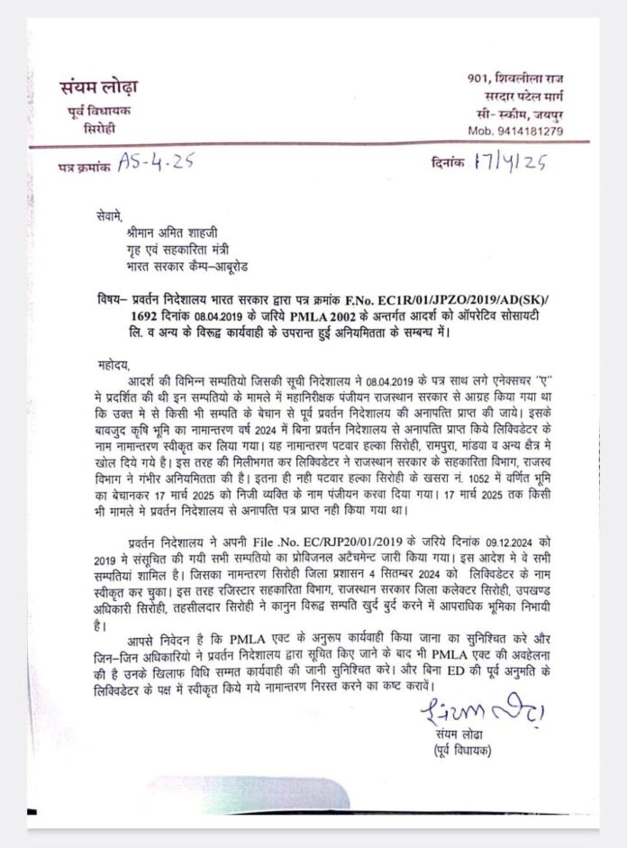 सिरोही। पूर्व मुख्यमंत्री सलाहकार संयम लोढ़ा ने भारत सरकार के सहकारिता एवं गृह मंत्री अमित शाह को पत्र लिखकर प्रवर्तन निदेशालय भारत सरकार द्वारा पत्र क्रमांक E.No. ECIR/01/JPZO/2019/AD(SK)/1692 दिनांक 08.04.2019 के जरिये PMLA 2002 के अन्तर्गत आदर्श को ऑपरेटिव सोसायटी लि. व अन्य के विरूद्ध कार्यवाही के उपरान्त हुई अनियमितता के खिलाफ कार्यवाही करने की मांग की। ज्ञापन में लोढ़ा ने बताया कि आदर्श की विभिन्न सम्पतियो जिसकी सूची निदेशालय ने 08.04.2019 के पत्र साथ लगे एनेक्सचर “ए” मे प्रदर्शित की थी इन सम्पतियो के मामले में महानिरीक्षक पंजीयन राजस्थान सरकार से आग्रह किया गया था कि उक्त में से किसी भी सम्पति के बेचान से पूर्व प्रवर्तन निदेशालय की अनापत्ति प्राप्त की जाये। इसके बावजुद कृषि भूमि का नामान्तरण वर्ष 2024 में बिना प्रवर्तन निदेशालय से अनापत्ति प्राप्त किये लिक्विडेटर के नाम नामान्तरण स्वीकृत कर लिया गया। यह नामान्तरण पटवार हल्का सिरोही, रामपुरा, मांडवा व अन्य क्षेत्र मे खोल दिये गये है। इस तरह की मिलीभगत कर लिक्विडेटर ने राजस्थान सरकार के सहकारिता विभाग, राजस्व विभाग ने गंभीर अनियमितता की है। इतना ही नही पटवार हल्का सिरोही के खसरा नं. 1052 में वर्णित भूमि का बेचानकर 17 मार्च 2025 को निजी व्यक्ति के नाम पंजीयन करवा दिया गया। 17 मार्च 2025 तक किसी भी मामले में प्रवर्तन निदेशालय से अनापत्ति पत्र प्राप्त नही किया गया था।