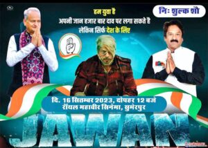 तखतगढ़ (पाली)। सुमेरपुर उपखंड मुख्यालय पर शनिवार को रॉयल महावीर सिनेमा में छात्र छात्राओं व युवाओं लिए ‘जवान’ की विशेष स्क्रीनिंग रखी गयी।