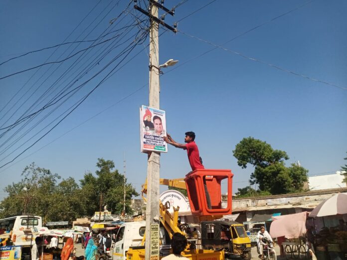 तखतगढ़ (पाली)। विधानसभा चुनाव चुनावों की तिथि घोषित होते ही सोमवार को आचार संहिता लग गई है। सुमेरपुर विभिन्न विधानसभाओ में 23 नवंबर को चुनाव होंगे। 3दिसम्बर को मतगणना होगी। आचार संहिता लगने के बाद नगरपालिका की टीमों ने चौराहा,पुराना बस स्टेण्ड,नागचौक,पादरली प्याऊ पर राजनैतिक पार्टी के पोस्टर व होर्डिंग्स हटाए गए। हालांकि पालिका ने द दिन पूर्व ही जगह-जगह लगे राजनैतिक पार्टियों के पोस्टर हटाने की कार्रवाई शुरू की थी। सोमवार को टीमों ने लॉडर, लिफ्ट मशीन से पोस्टर, बैनर, होर्डिंग हटाने की कार्रवाई की।